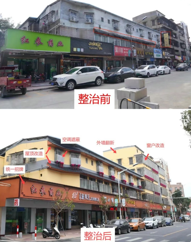 百千萬工程以提升房屋外立面形象為主,深刻塑造縣鎮村新面貌,推動鎮域建設邁向新高度。其中鎮街工程大力推進房屋外立面提升改造,選取圩鎮中心街及新開公路部分路段,沿線建筑進行外立面(含招牌、屋頂、外墻、窗戶等)改造。秉持實事求是,因地制宜的原則,對不同建筑采取針對性改造,已建成連片房屋外立面提升樣板,對連片建筑外立面的色調和風貌進行提升,既避免大拆大建,也大大提升了圩鎮品質和城市形象。具體做法如下:
