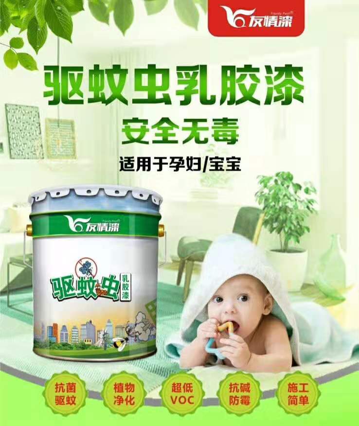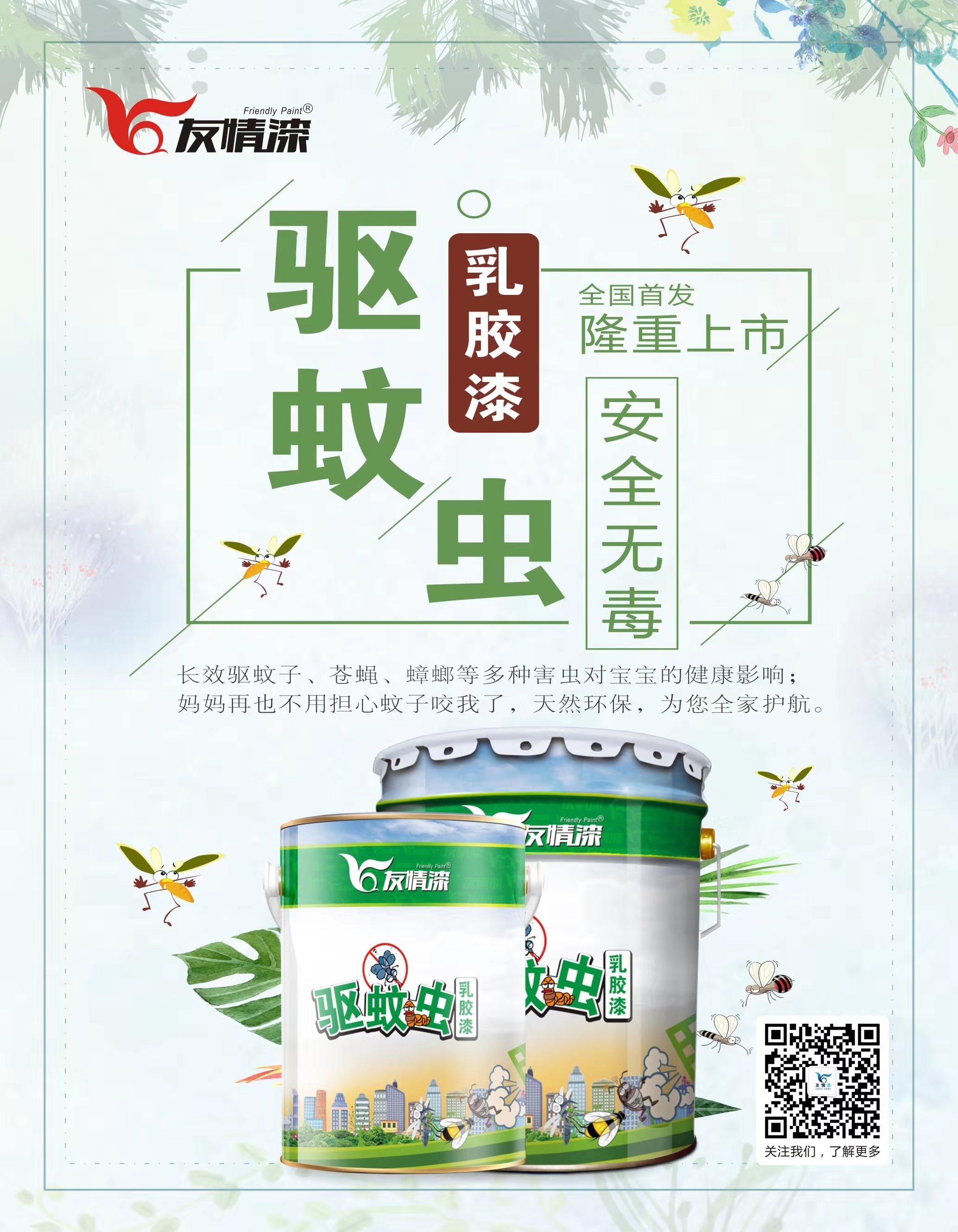 低碳環保友情漆推出驅蚊蟲乳膠漆采用無毒,安全環保的植物精油,通過吸附劑吸附達到緩釋功效,延長驅蚊時間,從而可降低乳膠漆的VOC,去除異味,解除產品的毒性,產品不但具有優異的耐水性耐堿性能,易洗耐擦,防霉防藻,安全環保,無毒等優點,還具有持久高效驅蚊以及凈化空氣的功能。友情漆的這款防蚊涂料是經過市場認可的廣受歡迎的一款防蚊涂料產品,對我國尤其是南方的消費者尤其需要。