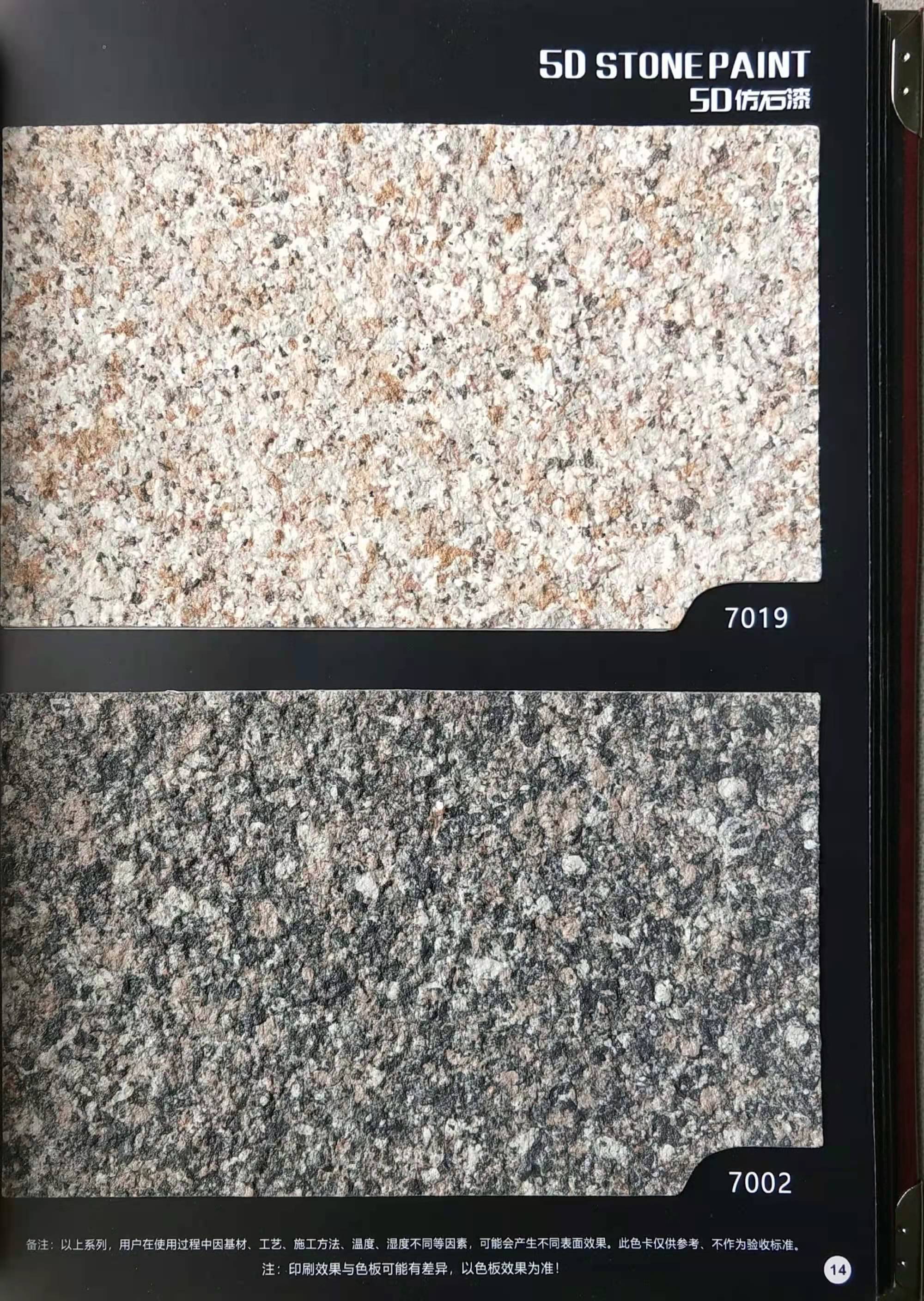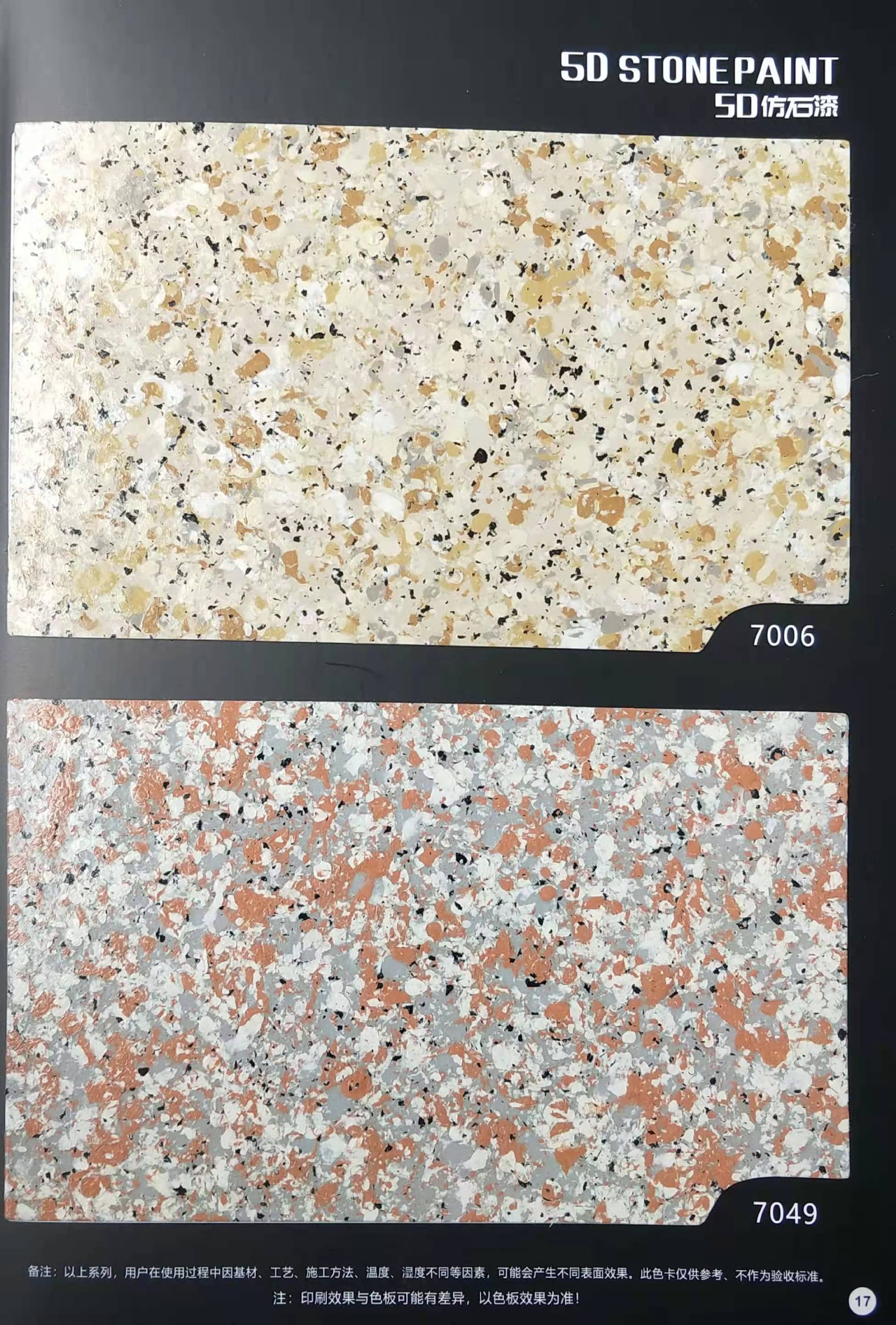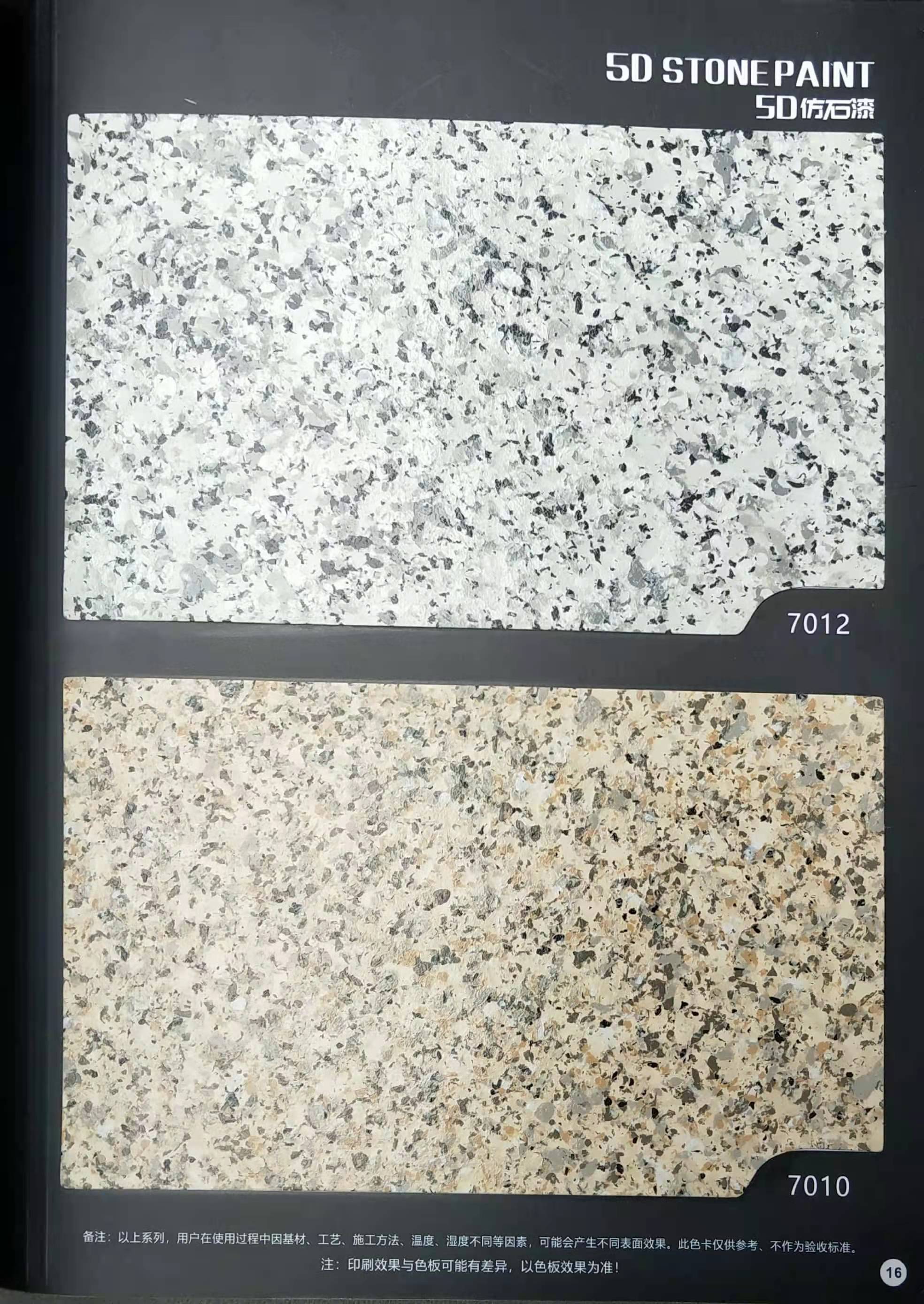 為方便市場客戶對5D仿石漆樣式的選擇,滿足消費者對其產品效果的體現,友情漆現在推出一套全方景立體式展現,用不同色彩仿石漆組合裝飾出來的墻面效果圖冊。