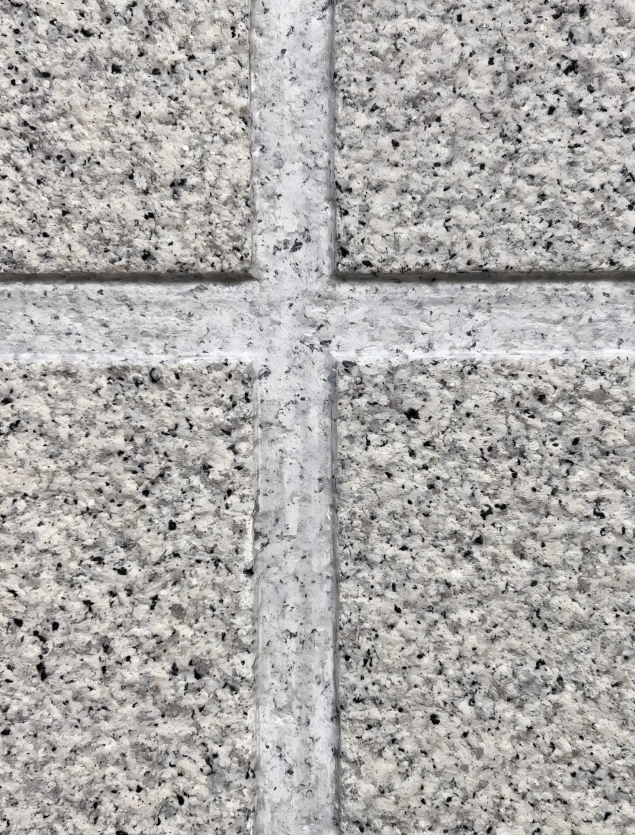 仿石漆工藝中較為經典的工藝,主要由一條黑線和一條白線組成,比起黑縫工藝,其層次立體感更加鮮明。主要工藝是先輥涂第一遍黑色底漆后進行彈線分格,貼第一道美紋紙做黑縫,在美紋紙上刷第二道底漆,后輥涂白色中涂,再貼第二道美紋紙(與第一道美紋紙平行)做白縫,后面正常繼續施工。