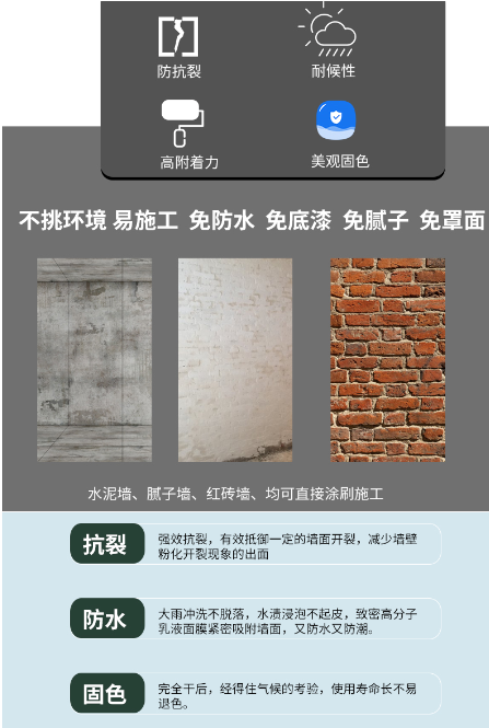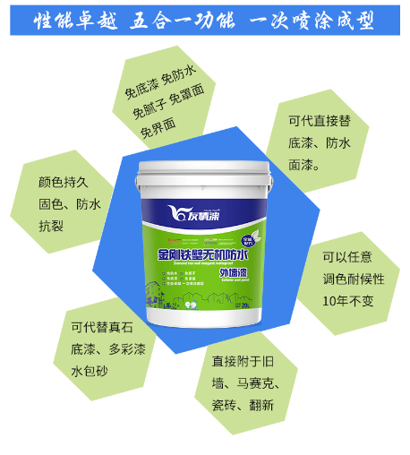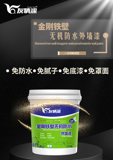 友情金剛鐵壁外墻漆是集防水和抗堿于一體的革命性外墻漆,可以避免外墻施工中,由于膩子和抗堿底漆的產品質量和施工不當引起的漆膜剝落、泛堿、開裂等問題。還能幫助工程商省去多余的人工和材料成本。具體產品介紹如下圖——